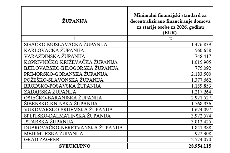 Dok će većina hrvatskih županija u 2026. godini kroz Odluku Vlade o minimalnim financijskim standardima, kriterijima i mjerilima za decentralizirano financiranje domova za starije osobe u 2026. godini, dobiti značajna sredstva države za rad domova za starije osobe, Ličko-senjska županija među njima se ne nalazi jer se dom Ličko-senjske županije nalazi u sanaciji.