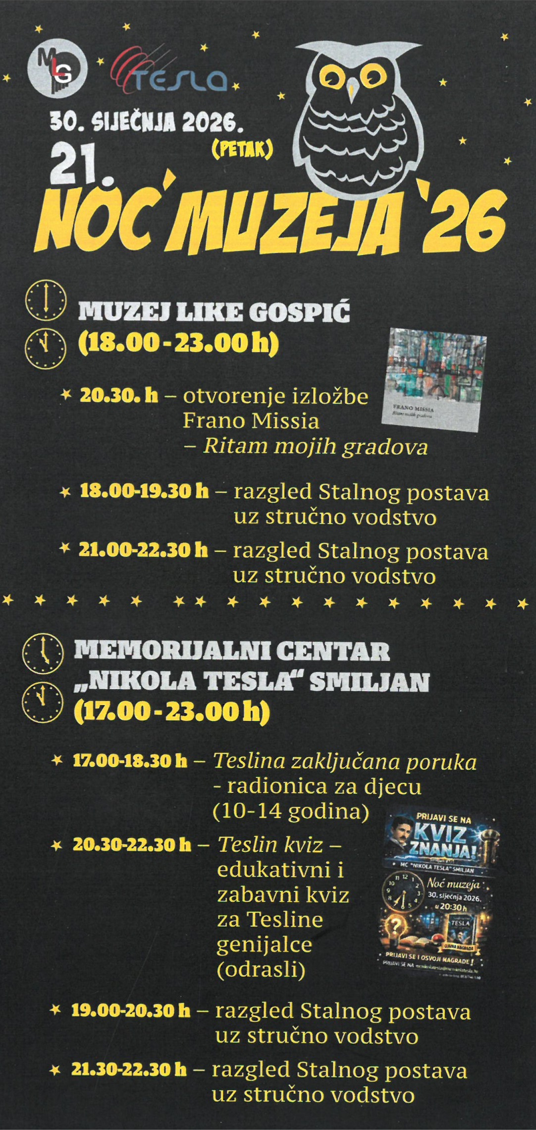 Noć muzeja u Memorijalnom centru “Nikola Tesla” u Smiljanu započinje već u 17 sati, kada se održava dječja radionica „Teslina zaključana poruka“ namijenjena djeci od 10 do 14 godina.