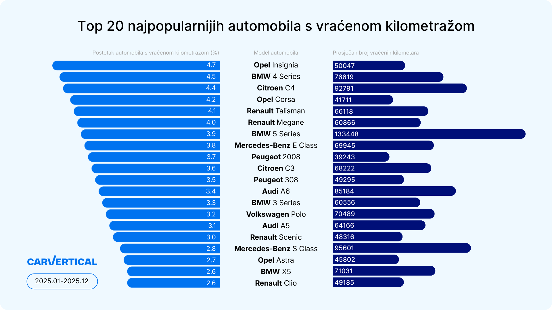 U 2025. godini najčešće manipulirana kilometraža u Hrvatskoj zabilježena je na Opel Insigniji. Istraživanje je pokazalo da je kod 4,7% primjeraka provjerenih na carVerticalu utvrđeno vraćanje kilometraže. Prosječni iznos manipulacije na ovom modelu iznosi 50.047 km. Na popisu modela s najviše manipulacija slijede BMW serije 4 (4,5%) i Citroën C4 (4,4%). Kod BMW-a serije 4, kilometraža je u prosjeku umanjena za 76.619 km, dok je kod Citroëna C4 zabilježeno smanjenje kilometraže od 92.791 km.