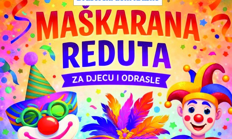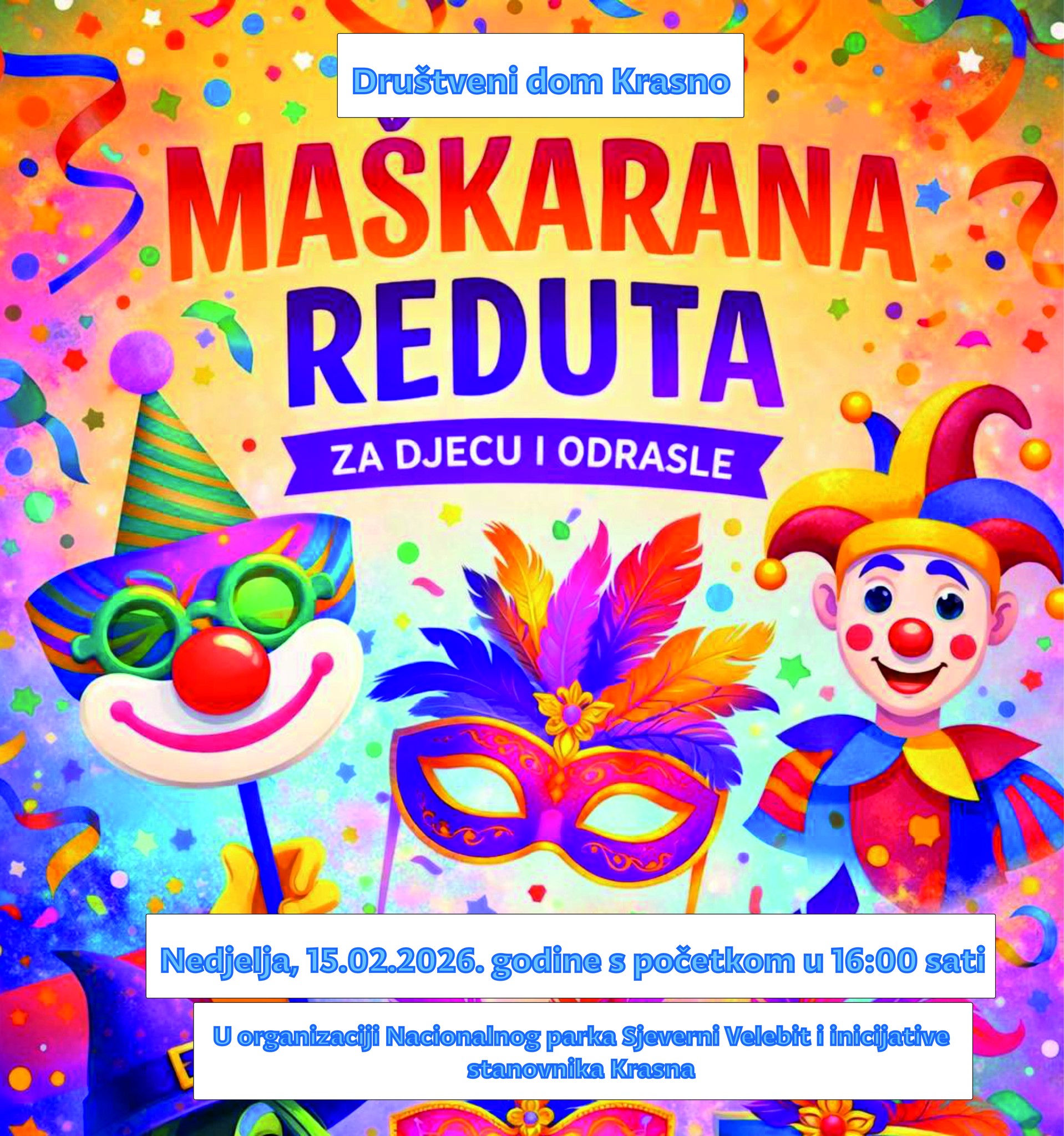 U Društvenom domu Krasno, u nedjelju, 15. veljače 2026., održat će se maškarana reduta za djecu i odrasle.