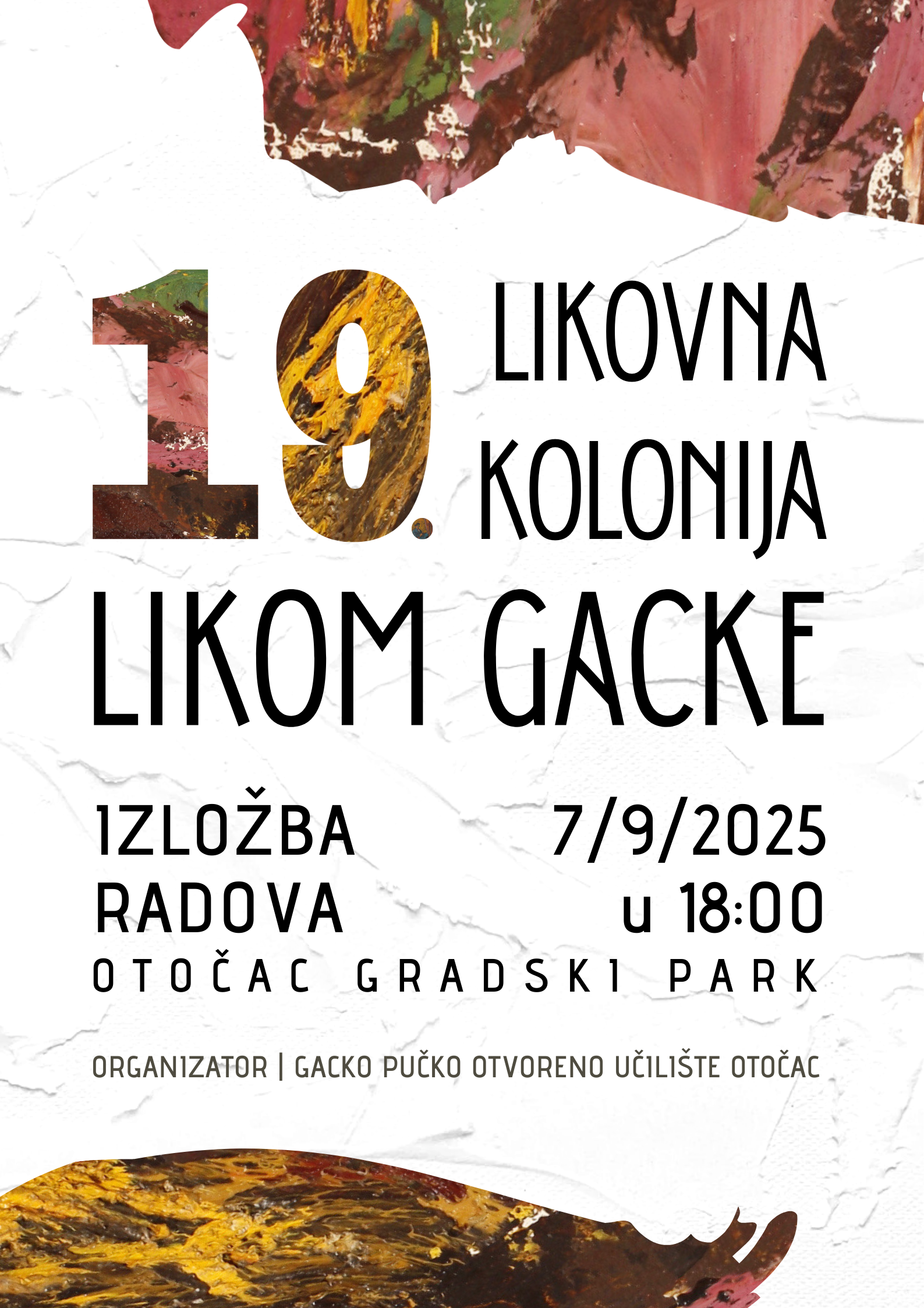 19. likovna kolonija LIKOM GACKE u organizaciji Gackog pučkog otvorenog učilišta Otočac održat će se 6. i 7. rujna 2025., a okupit će dvadeset amaterskih umjetnika iz različitih dijelova Hrvatske.