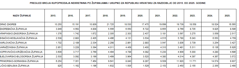 Podaci također pokazuju da se tržište nekretnina u Ličko-senjskoj županiji iz godine u godinu sve više aktivira, te je bilježen konstantan rast, a kao najbolje godine izdvajaju se 2025. i 2022. godina.