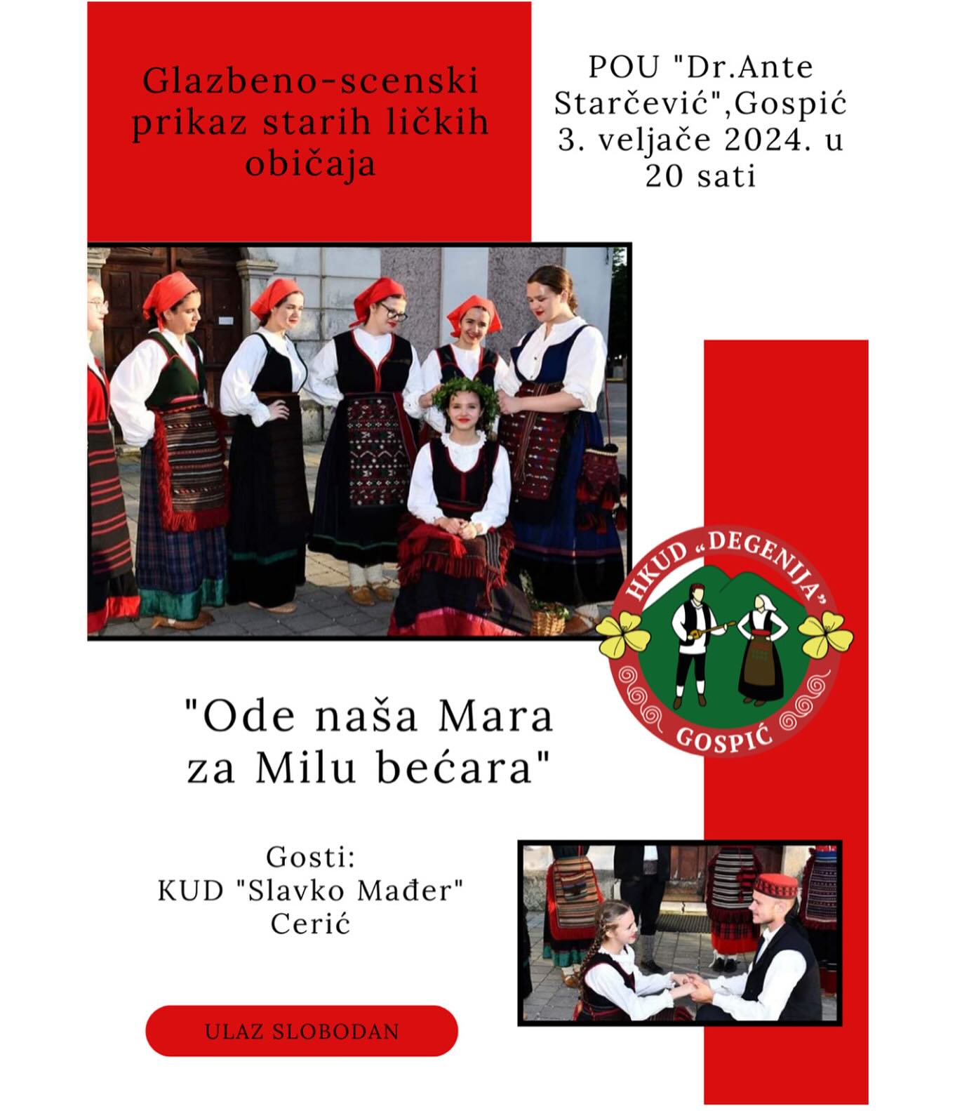 “Ode naša Mara za Milu bećara” naziv je glazbeno-scenskog prikaza starih ličkih običaja kojeg će u Pučkom otvorenom učilištu “Dr. Ante Starčević” ove subote održati HKUD “Degenija” iz Gospića