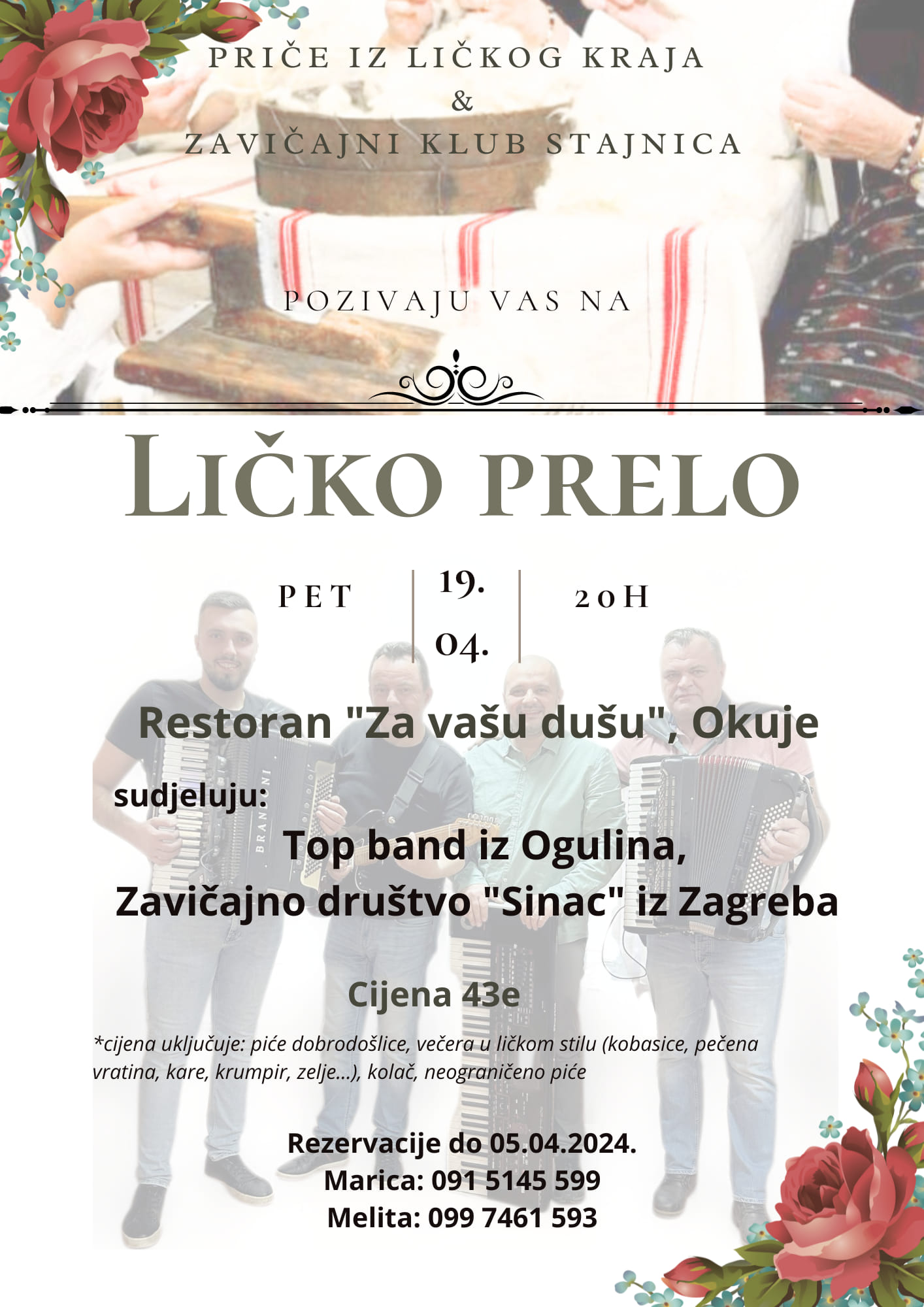 Veselu ličku večer u restoranu “Za vašu dušu” u Okujama svojim nastupima uveličat će Top band iz Ogulina i Zavičajno društvo “Sinac” iz Zagreba. Cijena ulaznice iznosi 43 eura po osobi, a uključuje piće dobrodošlice, večeru u ličkom stilu (kobasice, pečena vratina, kare, krumpir, zelje…), kolač i neograničeno piće.