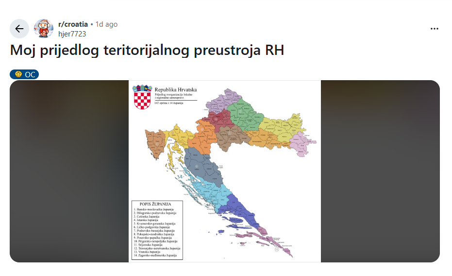Na društvenoj mreži Reddit pojavio se ovih dana zanimljiv prijedlog teritorijalnog preustroja Republike Hrvatske.
