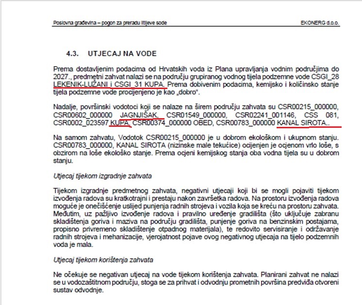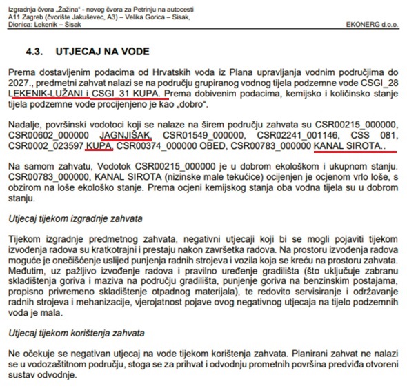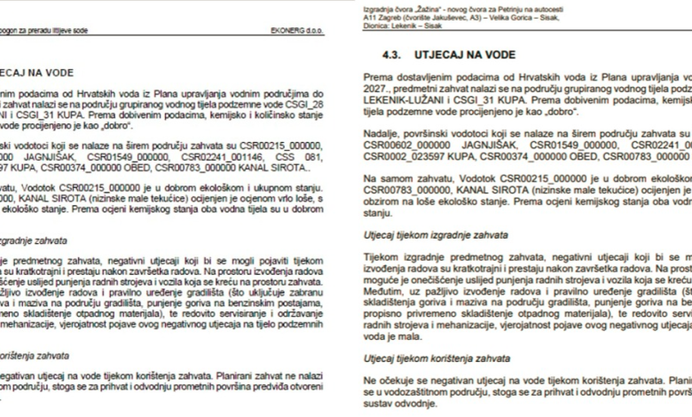 “Poglavlje elaborata o utjecaju na površinske i podzemne vode, ključno za kemijsko postrojenje smješteno na krškom terenu u neposrednoj blizini strateških rezervi pitke vode koja opskrbljuje Senj, Karlobag, Novalju i otoke Pag i Rab, preuzeto je iz Elaborata zaštite okoliša za izgradnju autocestovnog čvora Žažina kod Petrinje te sadrži analizu vodnih tijela Sisačko-moslavačke županije za prokjekt izgradnje prometnice i nemaju nikakve veze s predmetnom lokacijom ni predmetnim zahvatom.”, stoji u njihovom priopćenju.
