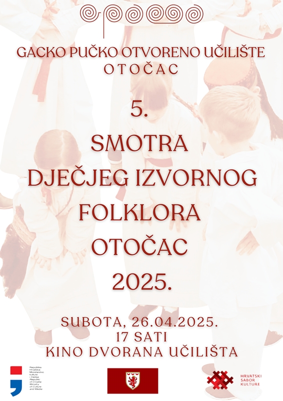 Gacko pučko otvoreno učilište Otočac organizira 5. Smotru dječjeg izvornog folklora koja će se održati 26. travnja 2025. u velikoj dvorani Učilišta s početkom u 17 sati.