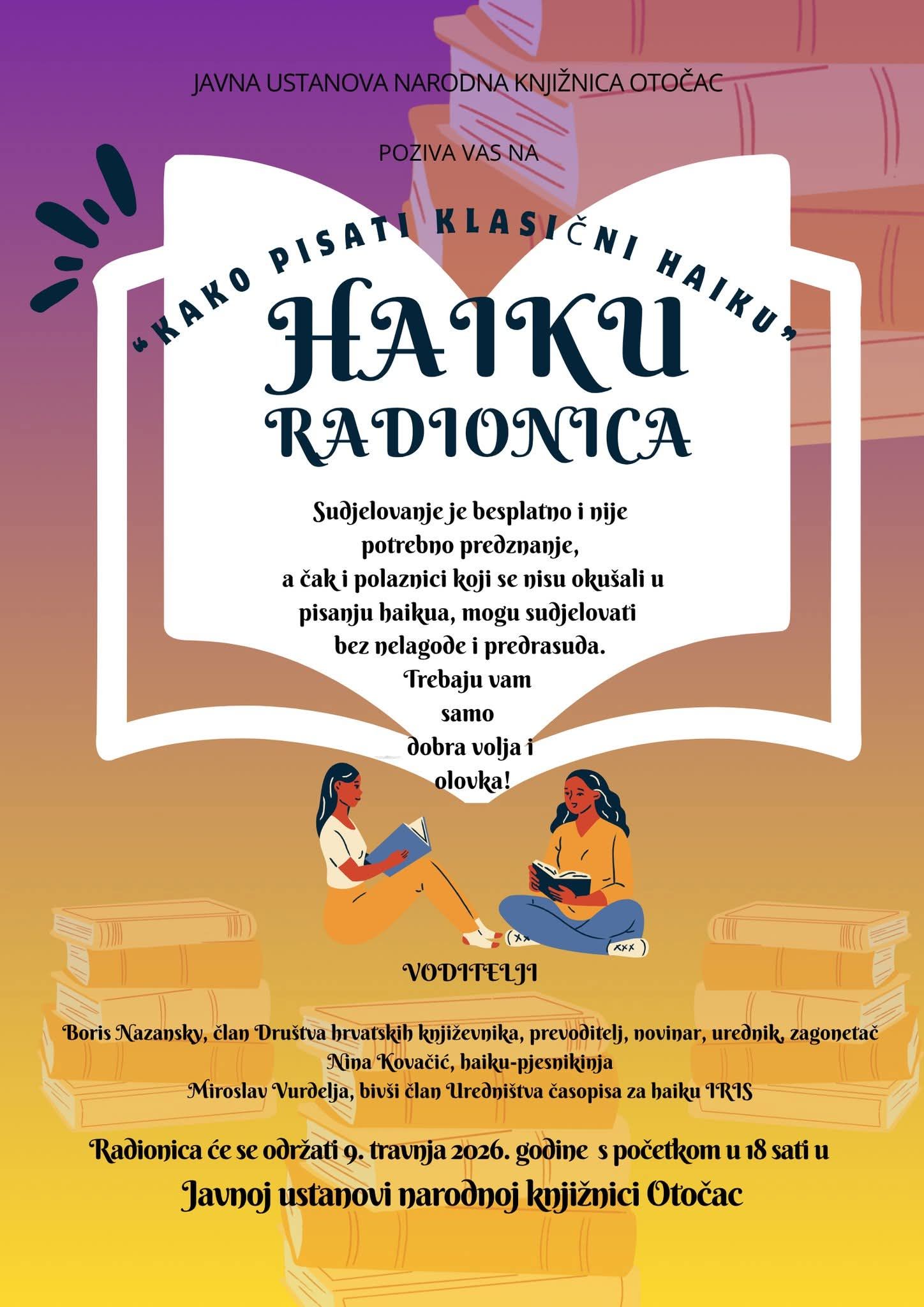 Gradska knjižnica Otočac u četvrtak, 9. travnja 2026., organizira zanimljivu radionicu pod nazivom “Kako pisati klasični HAIKU”.