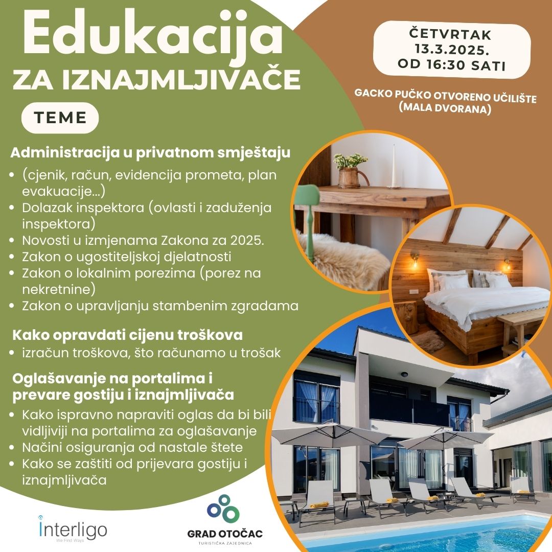 Edukacija će se održati u maloj dvorani Gackog pučkog otvorenog učilišta Otočac u četvrtak 13. ožujka 2025. s početkom u 16:30 sati. Edukacija je besplatna za sve zainteresirane iznajmljivače kao i one koji to tek žele postati.