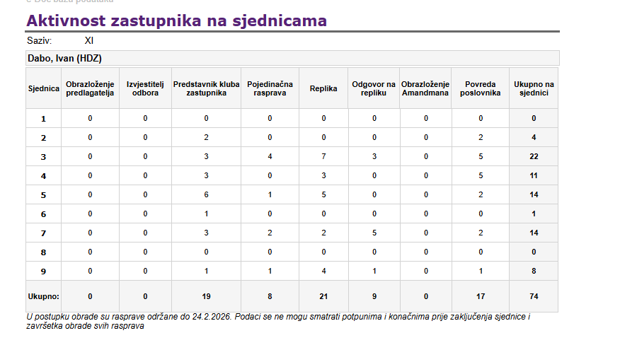 Prema podacima o radu na saborskim sjednicama do 24. veljače 2026., Dabo je ukupno zabilježio 74 javljanja za riječ.